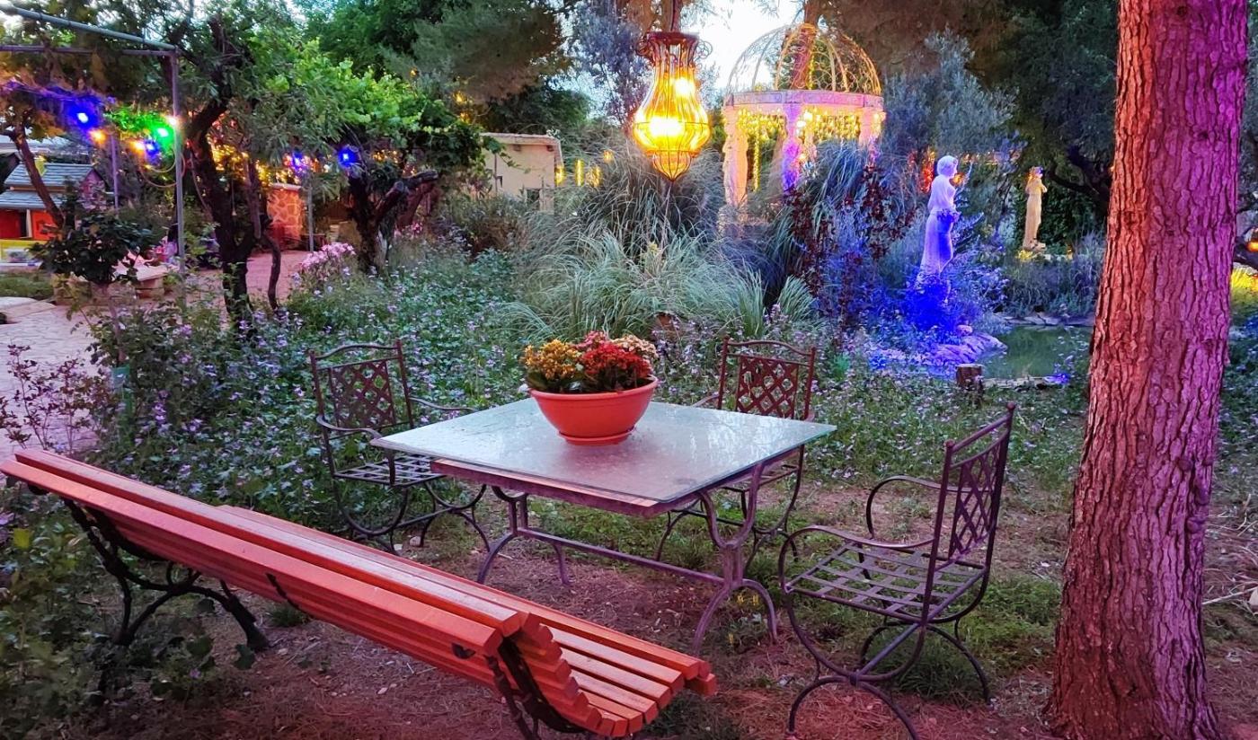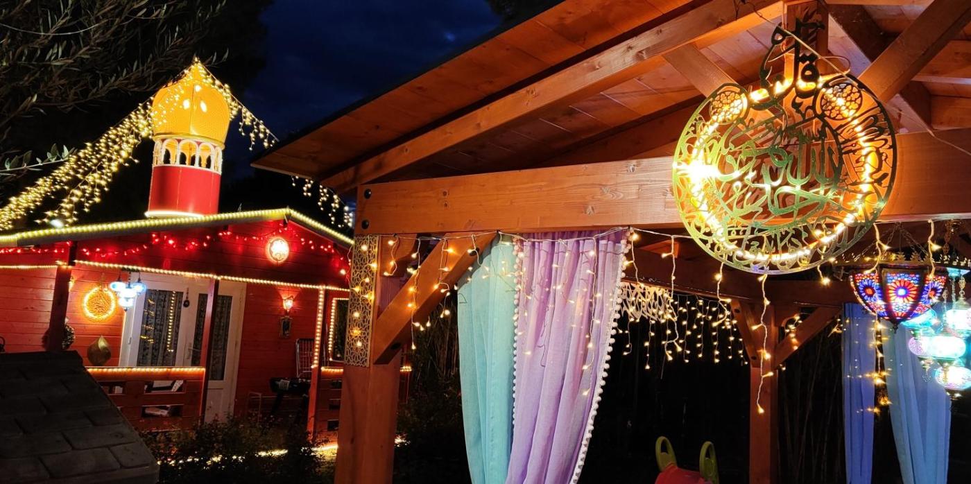 Refugio madera estilo árabe con estatuas, estanques y un pequeño zoo
